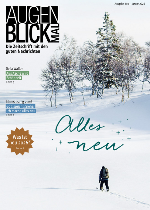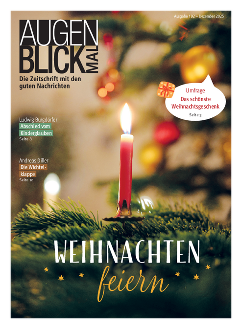 Genau das ist das Anliegen unserer monatlich erscheinenden evangelistischen Zeitschrift Augenblick mal. In ihr berichten Menschen über ihre Erfahrungen mit Gott und ermutigen so, sich auf den christlichen Glauben einzulassen. Denn sie sind wie wir überzeugt, dass jeder Orientierung und einen Halt im Leben benötigt - und dass der christliche Glaube tragfähige Antworten gibt auf die wesentlichen Fragen der Menschen.